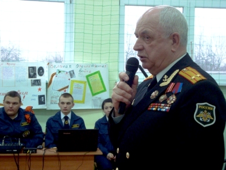 Валентин Гаврилов рассказал ребятам о том, как он начал воевать, учился в Ульяновском училище тяжелых танков, как подбил в одном бою сразу три танка. Кадеты узнали, что фронтовик участвовал в Сталинградской и Курской битвах, был ранен, освобождал Белоруссию, штурмовал Кенигсберг. Герман Бич, который еще ребенком был вывезен из блокады по Ладожскому озеру, говорил о подвиге ленинградцев, их стойкости и мужестве. Сын фронтовика Александр Исаев половину жизни отдал армейской службе, воевал в Афганистане. Он поведал об эпизодах той войны.