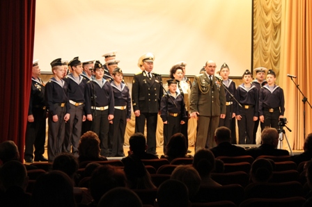Перед началом концертной части к участникам смотра обратился председатель жюри конкурса, руководитель областного «Морского собрания», капитан первого ранга Николай Якубовский. Он напомнил собравшимся о подвиге экипажа подводной лодки «С-13» под командованием Александра Маринеско. 70 лет назад, в январе 1945 года, в Балтийском море ею был потоплен немецкий лайнер «Вильгельм Густлофф», а затем, спустя 10 дней, – военный транспорт «Генерал фон Штойбен». Николай Степанович пожелал ребятам быть достойными наследниками знаменитых моряков-подводников.